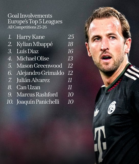 而在本场比赛梅开二度的凯恩,也让自己本赛季的个人数据达到了22球3球的水准。由此,他不仅成为了本赛季首位五大联赛制造进球超过20并达到25球的球员,更是领跑本赛季制造进球的榜单。
