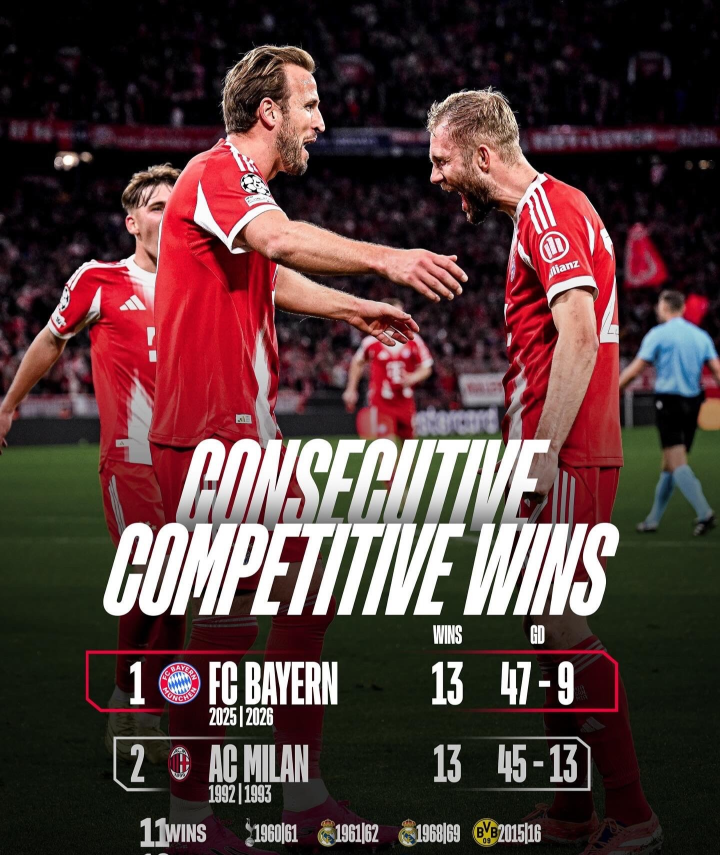 本场赛前,在25/26赛季的开赛至今的13场比赛全部获胜的拜仁,就追平了AC米兰曾在1992-1993赛季所创造的五大联赛历史开局最长连胜纪录。