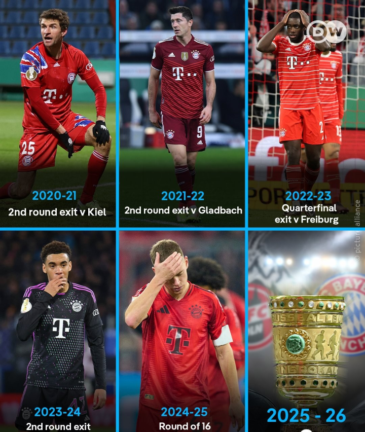 自2019-2020赛季实现了队史首次6冠王的荣誉之后,拜仁也出乎意外的迷失在了此后参与德国杯的比赛当中--在过去的5个赛季,拜仁不仅从未在德国杯有过突破1/4决赛的成绩,更是有过3次在第二轮就暴露出局的情形。而且,还出现了0-5不敌门兴的惨败,也让拜仁这支德国杯历史上夺冠次数最多的球队、18次,几乎在过去的5年都和德国杯没有任何的关联。